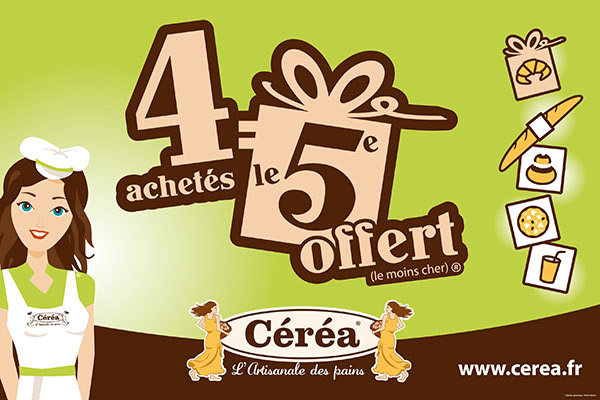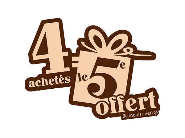 CAMPAGNE PUBLICITAIRE "4 ACHETÉS = LE 5e OFFERT" | visuel | affiche | drapeau | sachet | boîte