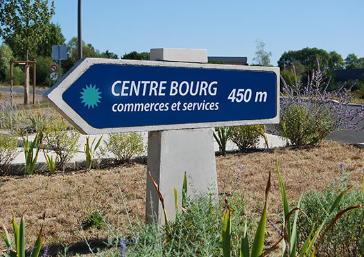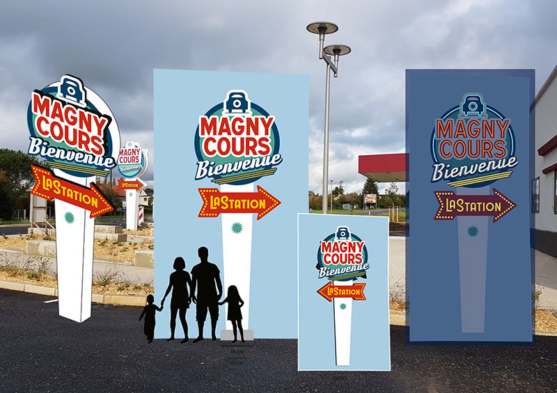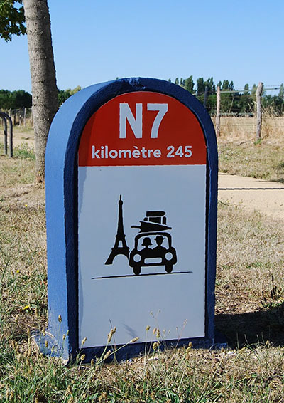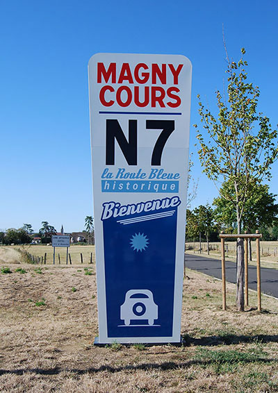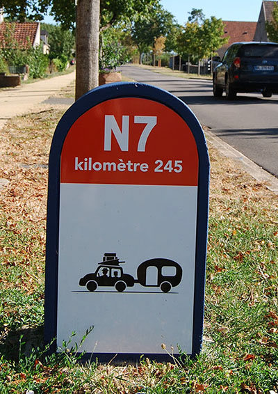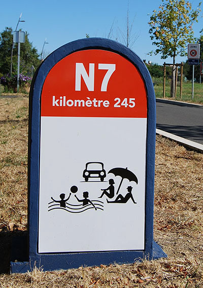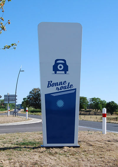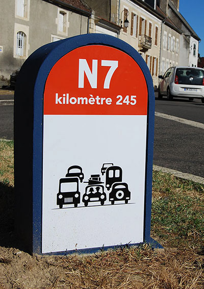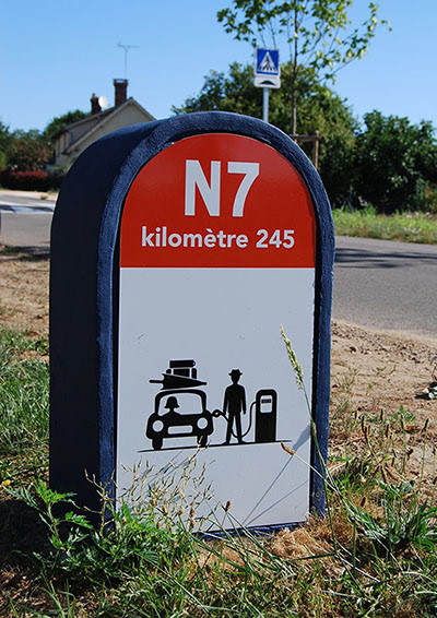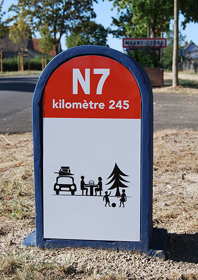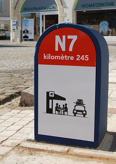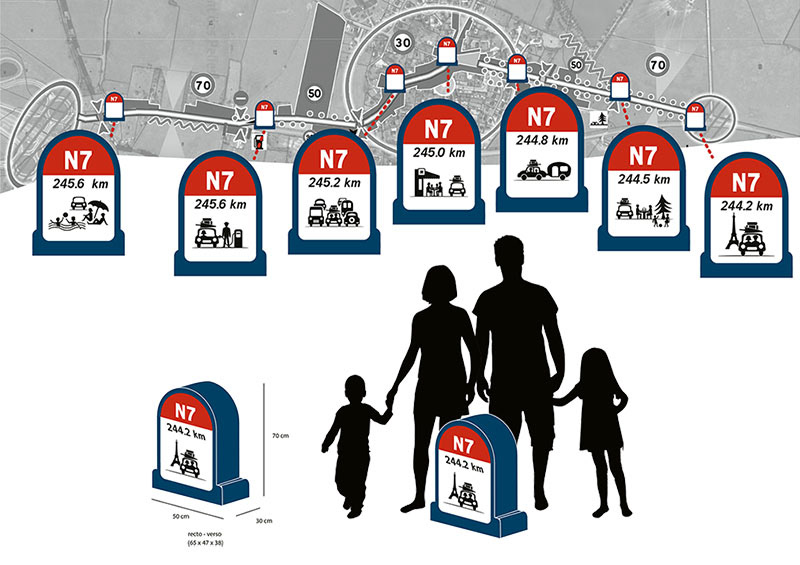 signalétique globale du centre-bourg sur le thème de la Nationale 7 | totems, bornes, panneaux